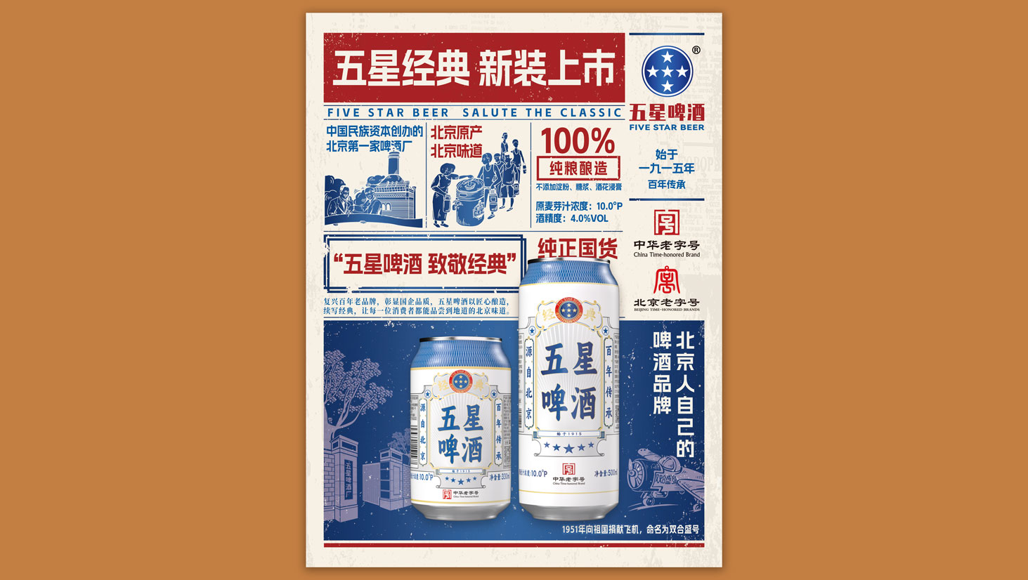 Sonhoshin & Five Star Beer traces its roots back to the Beijing Sonhoshin Soda Factory, which was founded in 1915 as China's first domestically funded brewery. It stands as a true witness to a century of brewing evolution. In February 2024, it was recognized by the Ministry of Commerce as a "China Time-honored Brand", highlighting the brand’s rich heritage and enduring vitality.